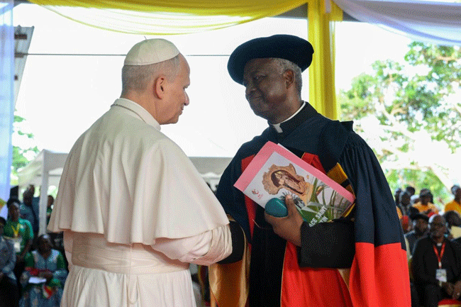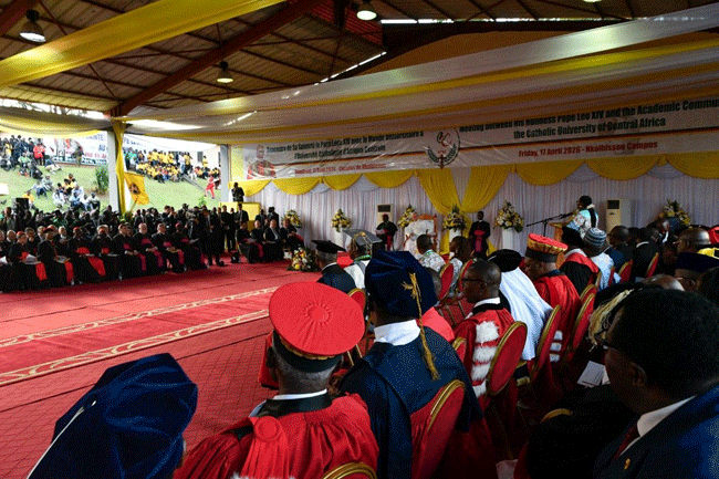 Tôi rất vui mừng được ngỏ lời với anh chị em tại Đại học Công giáo Trung Phi này, một nơi xuất sắc cho việc nghiên cứu, truyền bá kiến thức và đào tạo bao thế hệ trẻ. Tôi bày tỏ lòng biết ơn đối với các cấp lãnh đạo nhà trường vì sự đón tiếp nồng hậu và vì sự dấn thân không ngừng của họ cho sự nghiệp giáo dục. Thật là một niềm hy vọng khi tổ chức này, được thành lập năm 1989 bởi Liên hiệp các Hội đồng Giám mục Trung Phi, đã trở thành một ngọn hải đăng phục vụ Giáo hội và châu Phi trong công cuộc tìm kiếm chân lý, thúc đẩy công lý và tình đoàn kết.