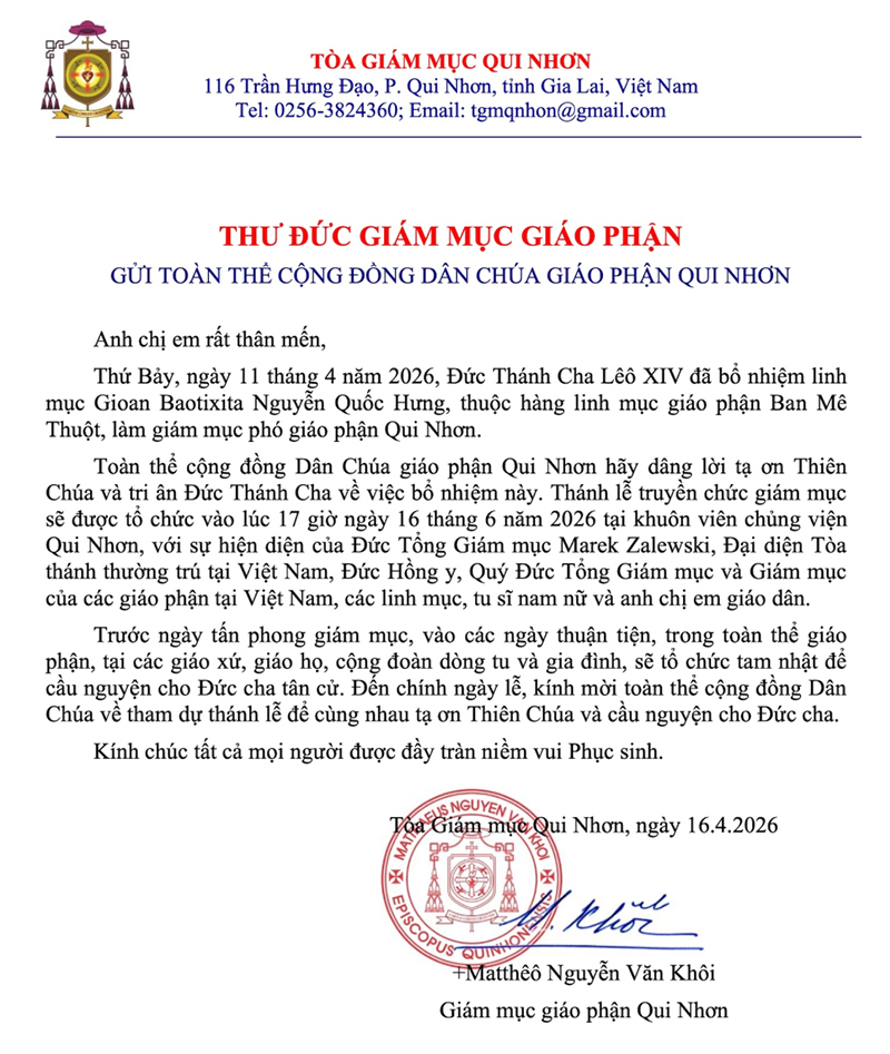 Thông báo về Thánh lễ Truyền chức Giám mục phó Gioan Baotixita Nguyễn Quốc Hưng 18/04/2026 Nguồn: gpquinhon.org