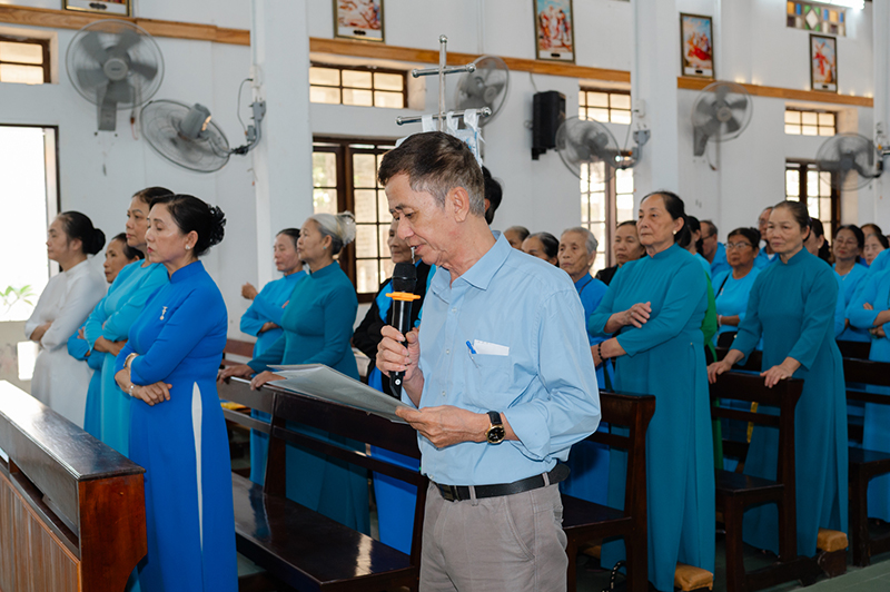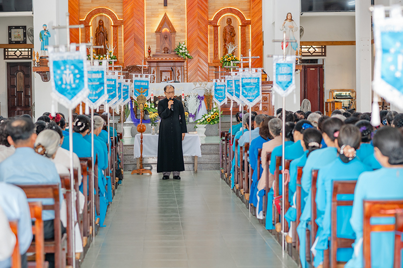 Tiếp đó, Cha Hạt trưởng Antôn Nguyễn Văn Thăng chia sẻ về ý nghĩa việc dâng mình cho Đức Mẹ và đời sống chứng tá của hội viên Legio. Cha nhấn mạnh: dâng mình không chỉ là lời đọc trong nghi thức, nhưng là một chọn lựa sống mỗi ngày theo gương khiêm nhường, vâng phục và bác ái của Mẹ Maria. Người hội viên được mời gọi trở nên chứng nhân giữa đời, mang Chúa đến cho tha nhân qua đời sống gương mẫu và những việc phục vụ âm thầm.