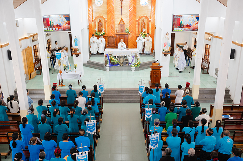 Sau đó là Thánh lễ do Cha Hạt trưởng An tôn chủ sự, và quý Cha Linh giám cùng đồng tế. Trong bài giảng lễ, Cha Phanxicô Xaviê Trần Vương Quốc Minh, Linh giám Curia mời gọi các hội viên sống tinh thần dâng hiến cách cụ thể: để Mẹ Maria dẫn đưa đến với Chúa Kitô, trở nên khí cụ bình an, mang tình yêu và lòng thương xót đến cho mọi người.