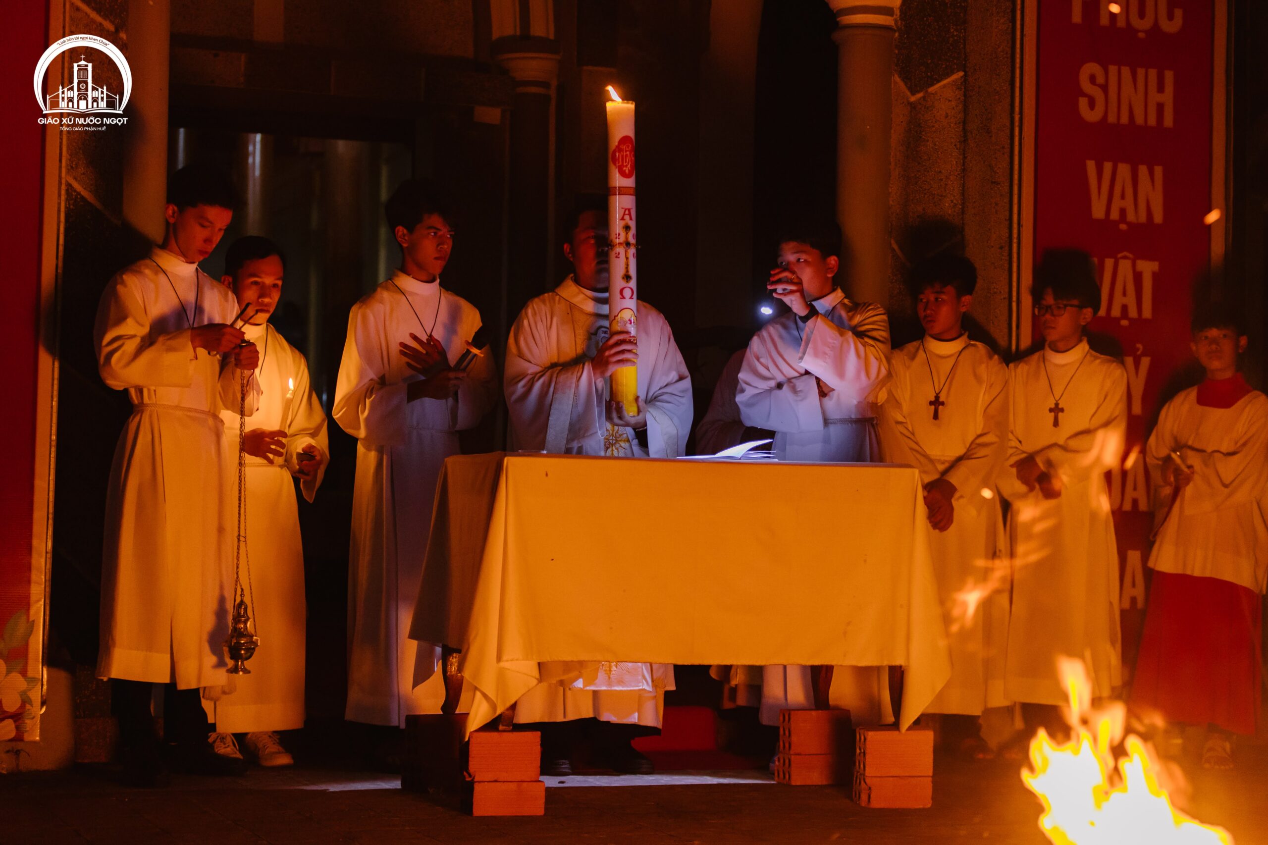 Tại sân tiền đường Nhà thờ, Cha Quản xứ chủ sự nghi thức làm phép lửa mới, làm phép và kiệu nến Phục sinh. Với nến sáng trên tay, cộng đoàn lắng nghe Cha Phó xứ Công bố Tin Mừng Phục sinh – Exsultet.