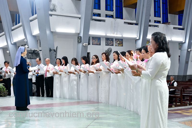 Thánh lễ tiếp nối sau nghi thức tận hiến với sự hiện diện đông đảo của cộng đoàn dân Chúa. Trong bài giảng lễ, Cha chủ tế đã gợi lại tiếng “Xin Vâng” đầy tín thác của Đức Maria “Lời thưa xin vâng của Mẹ không chỉ là một lời nói thốt ra trên môi miệng, mà còn gói trọn cả một tâm tình phó thác tuyệt đối vào Thiên Chúa- Đấng Mẹ tôn thờ” và mời gọi mọi tín hữu, cách riêng các anh chị Hiệp hội: “Chúng ta là con cái của Mẹ Maria, chúng ta trao cả cuộc đời mình cho Chúa qua tay Mẹ, để Mẹ biến đổi chúng ta thành những đứa con ngoan của Mẹ… Chính những “xin vâng nhỏ bé” này sẽ làm nên một đời Kitô hữu lành thánh thứ thiệt”.