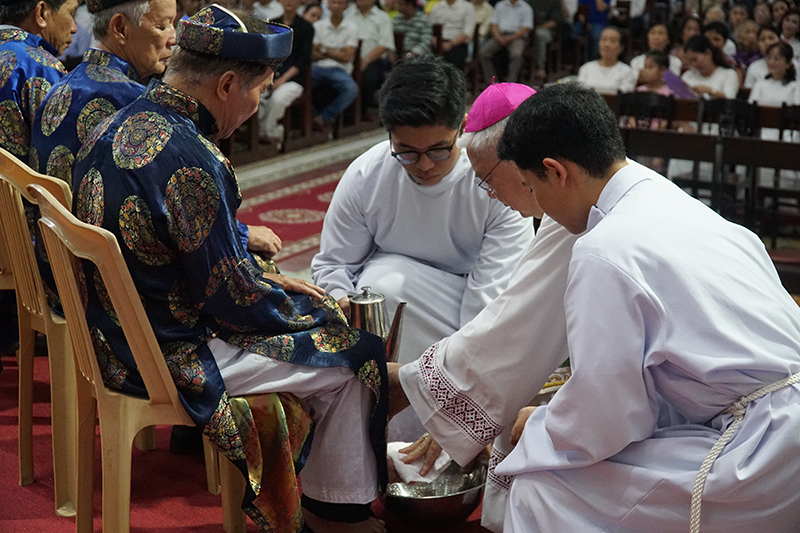 Sau bài giảng lễ, Đức Cha chủ tế cử hành nghi thức rửa chân cho 12 vị Khu vực trưởng trong Giáo xứ, hình ảnh vị mục tử khiêm hạ và nhân hiền, tinh thần phục vụ yêu thương để thực hành sứ mạng của người mục tử như Chúa Kitô – Vị mục tử nhân lành: “Con Người đến không phải để được phục vụ, nhưng là để phục vụ”.