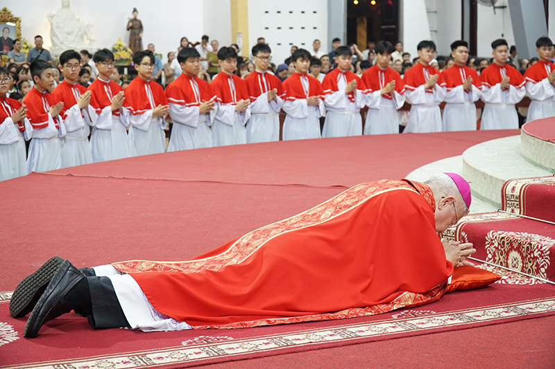 Nghi thức tưởng niệm cuộc thương khó của Chúa Giêsu do Đức TGM Giuse Đặng Đức Ngân cử hành vào lúc 18g30. Khởi đầu nghi thức, Đức Cha chủ sự phủ phục trước bàn thờ thể hiện sự khiêm nhường và sự đau buồn của Giáo Hội trước cuộc thương khó của Chúa Kitô.