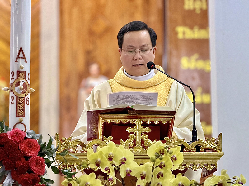 Trong bài giảng lễ, Cha Têphanô nhấn mạnh ý nghĩa của mầu nhiệm Chúa Phục Sinh Chúa đã chết và đã sống lại, đã chiến thắng bóng đêm sự dữ, đã chiến thắng tội lỗi. Qua đó, ngài mời gọi cộng đoàn can đảm từ bỏ con người cũ – con người của tội lỗi – để sống đời sống mới với Chúa Kitô Phục Sinh.