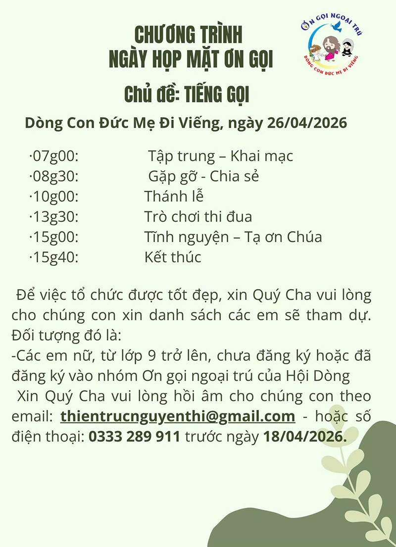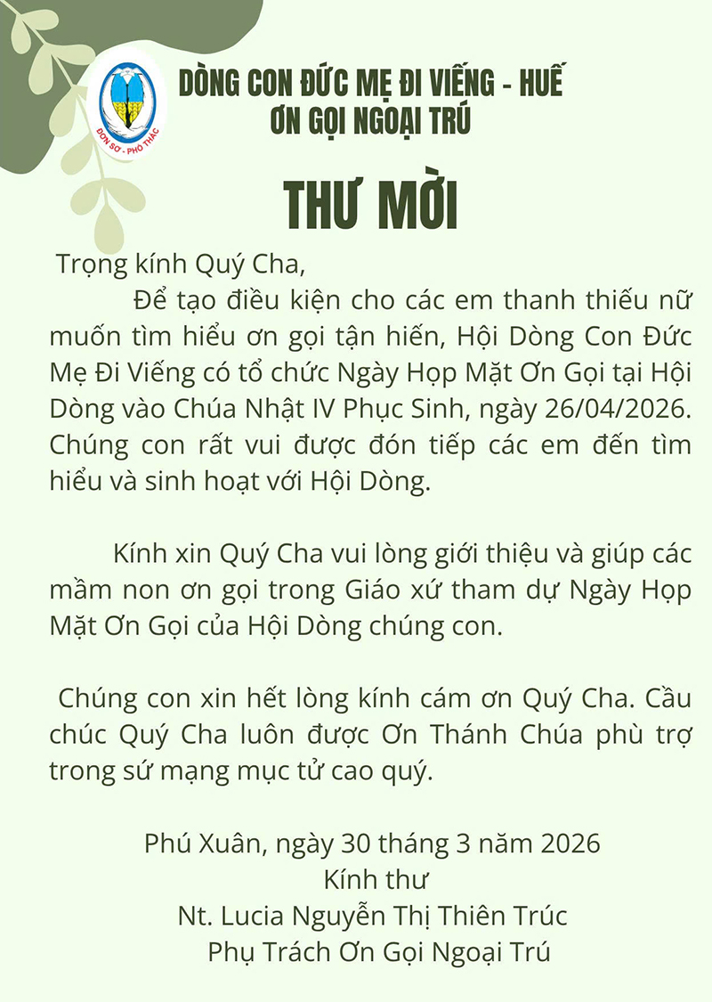 Thư mời Ngày Họp Mặt Ơn Gọi Hội Dòng Con Đức Mẹ Đi Viếng Huế năm 2026